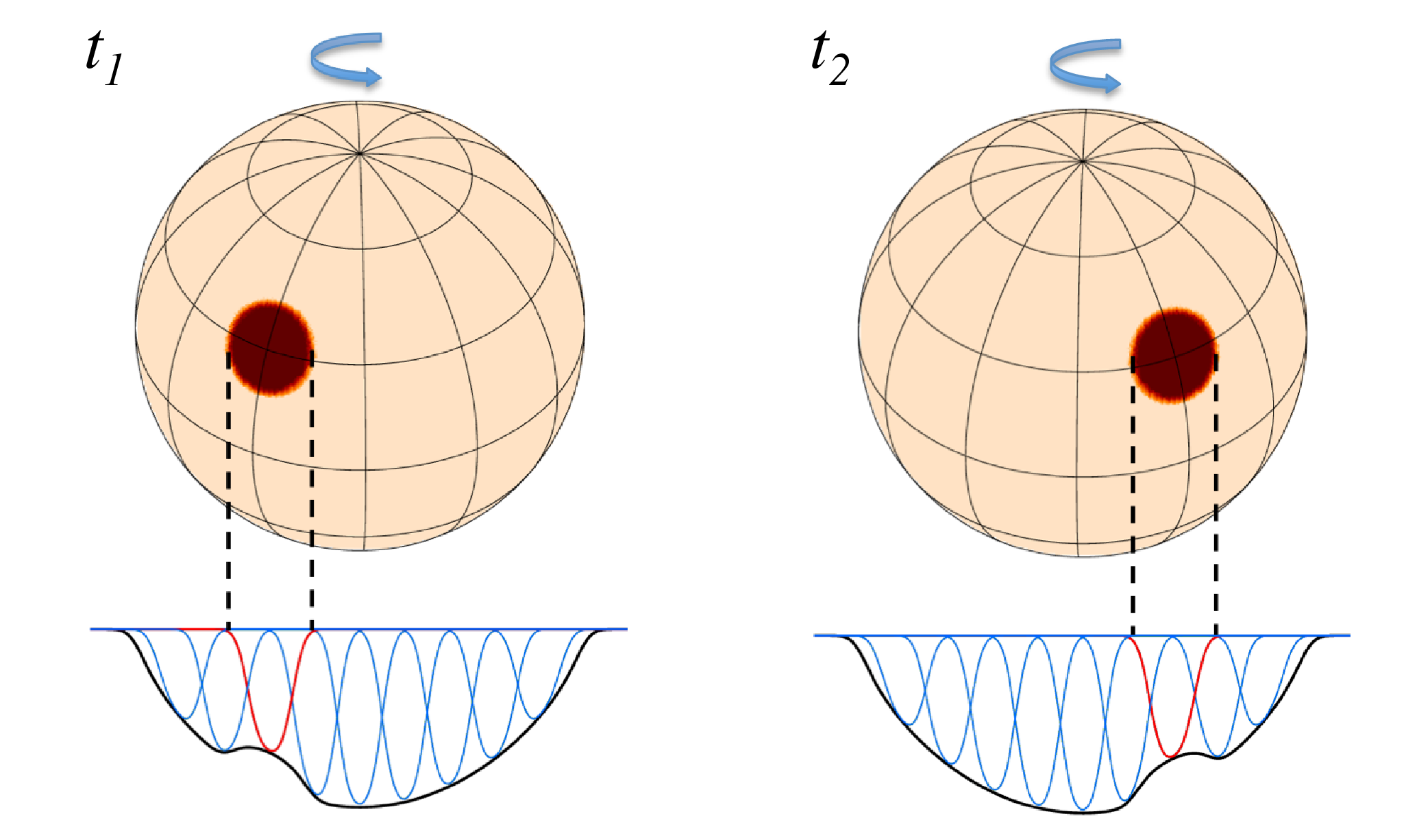 The plot below illustrates basic principle of DI. Due to Doppler effect arising from the stellar rotation, spectral contributions of different surface zones are shifted in wavelength. Any significant surface structure produces a perturbation, which shows up as a distortion (a bump or a dip) in the disk-integrated stellar spectral line profile. This distrotion moves across line profile as the star rotates. Instanteneous longitude of a star spot can be determined from the position of the distortion within the spectral line. Latitude can be inferred from the amplitude and speed of the motion of the distortion across line profiles.