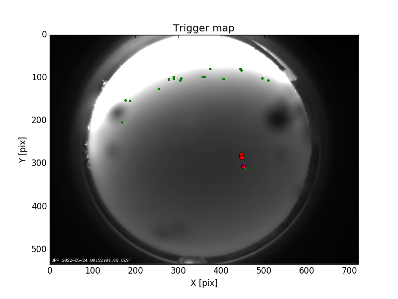 First detection at Az = 242.4 Alt= 58.9 Last detection at Az = 229.0 Alt= 54.9 |